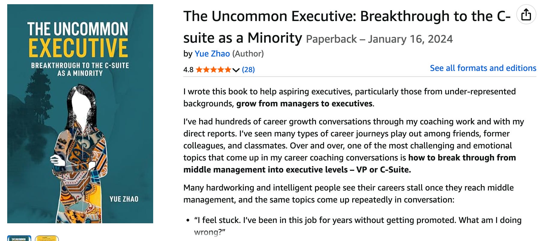 My birthday is coming up at the end of the month. As a gift to all my readers, I am offering my book, The Uncommon Executive: Breakthrough to the C-suite as a Minority at $2.99 (Kindle) and $9.99 (paperback) for the next two weeks. It contains hard-learned lessons and mindsets on executive leadership and is the book I wish I had while struggling against the double ceiling as a woman and minority.