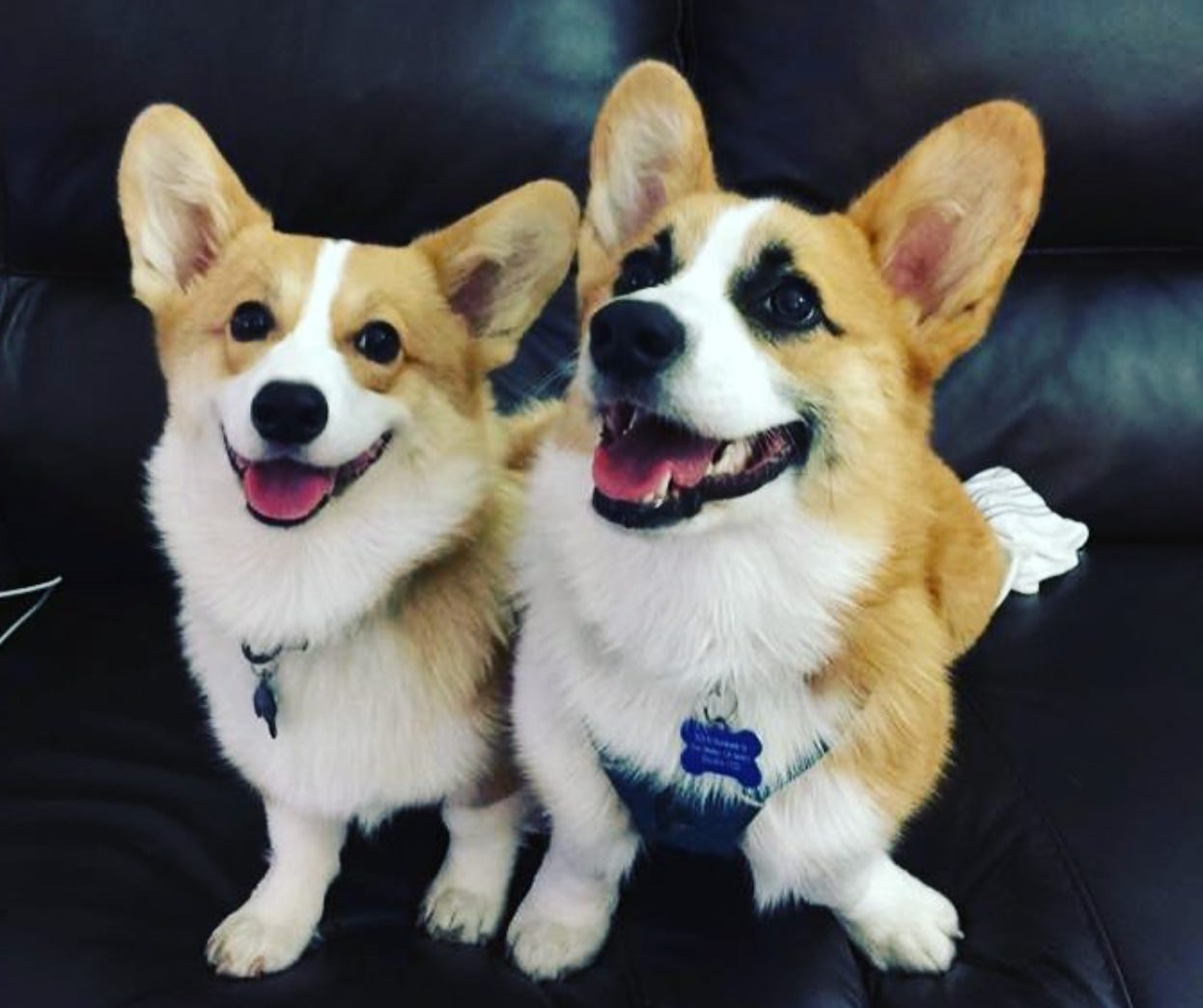 (Teddy the corgi with Dash the corgi; Sofa at home)