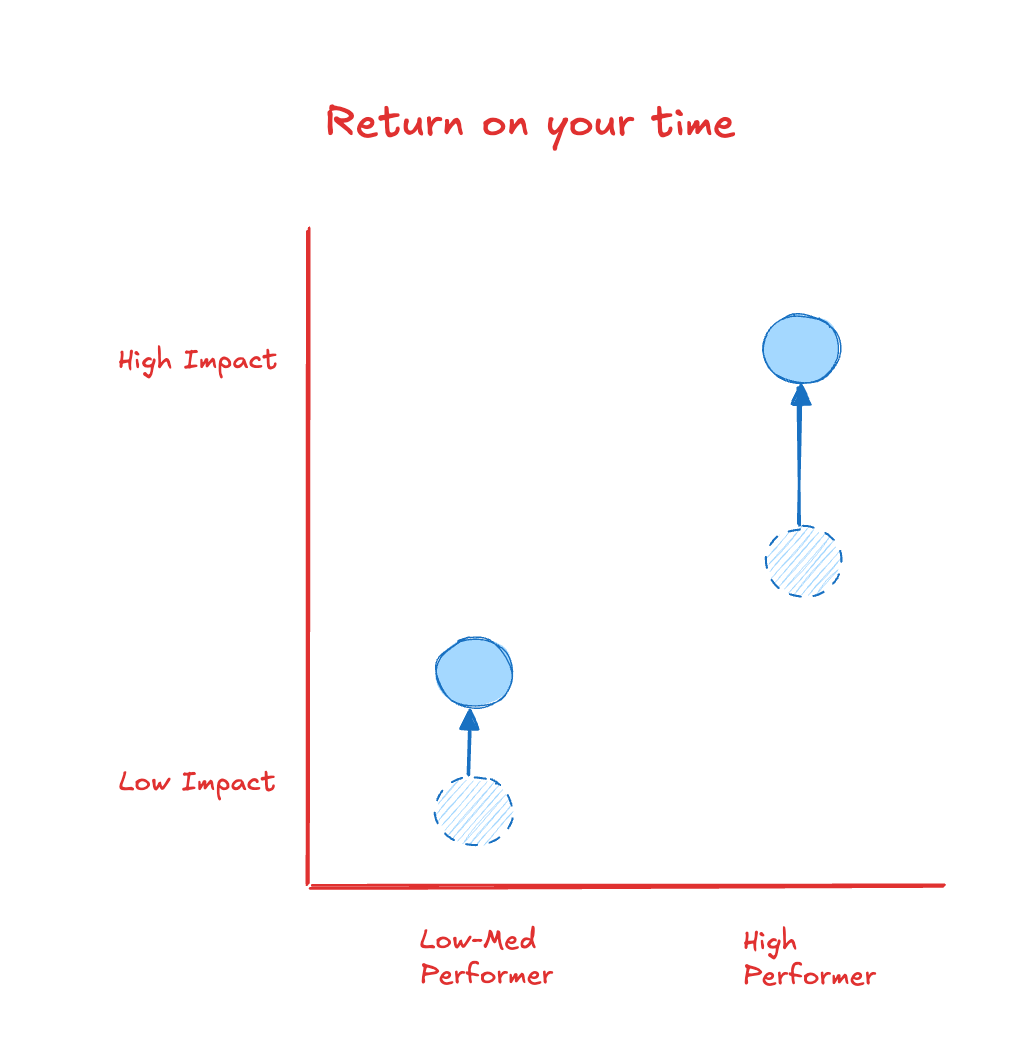 It turns out that those same dollars are often much better spent on high performers instead. It is often much easier to boost the positive momentum of a rising star than to turn around the perception of a low performer. Rather than helping your low performers go from 0.5X to 1X, you can help your high performers go from 3X to 6X. In both cases, you are doubling impact — but look at the difference in magnitude.